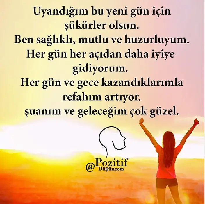 Uyandığım bu yeni gün için şükürler olsun. Ben sağlıklı mutlu ve huzurluyum. Her gün her açıdan daha iyiye gidiyorum. Her gün ve gece kazandıklarımla refahım artıyor, şu anım ve geleceğim çok güzel... Öyledir Amin