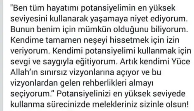 valla benim annem şokta :) ben yılların negatifi olumsuzu bir haftadır başıma saksı düştü sanki :) hep kötü düşünüp başıma da hepsini getirdim. bundan sonra bir de böyle deneyim diye başladım.ilk zorlama oldu ama şu an inanarak yapıyorum. you tube tan olumlamalar yazıp dinliyorum mesela..burdaki arkadaşlardan öğrendiklerimi uyguluyorum.bikaç gün dene sonrası zaten kendiliğinden geliyor..