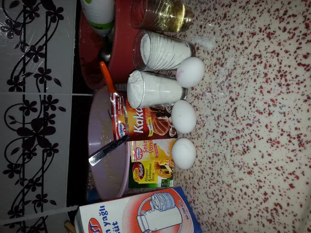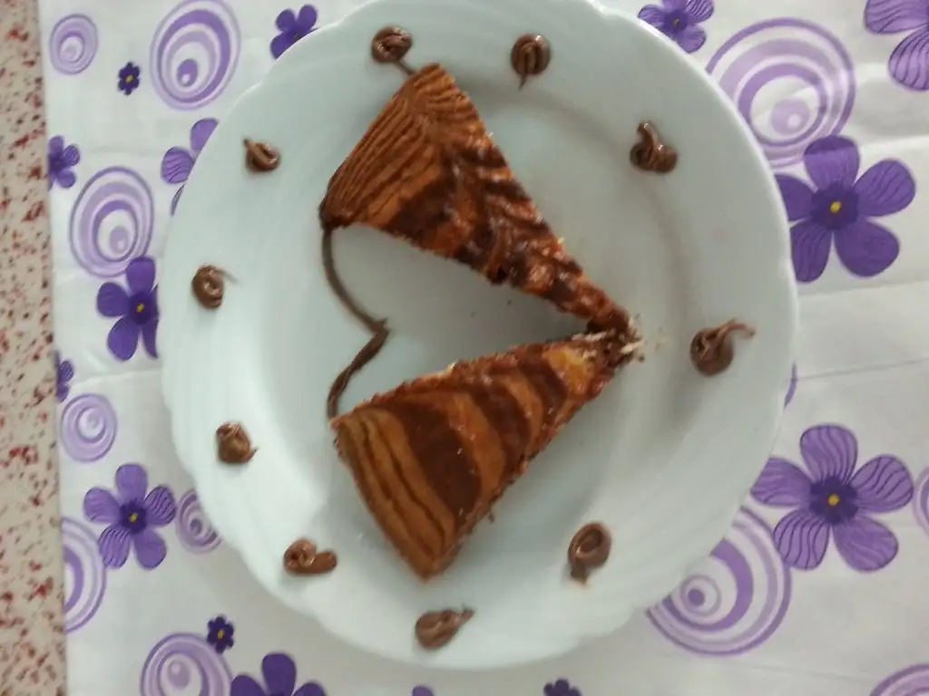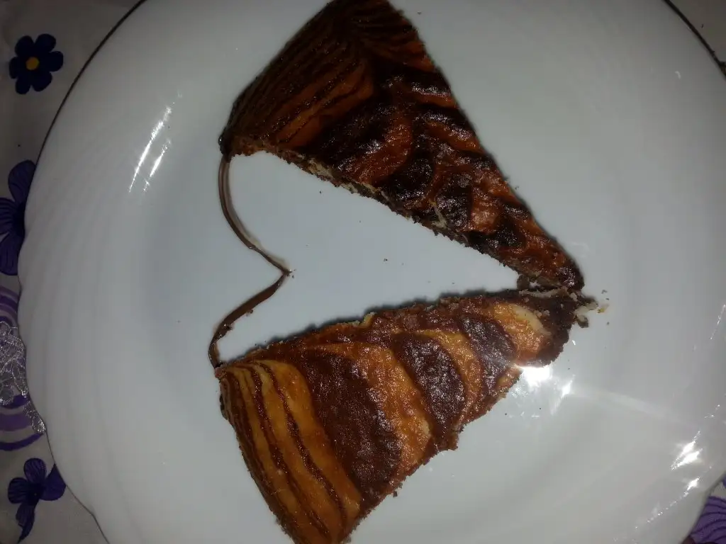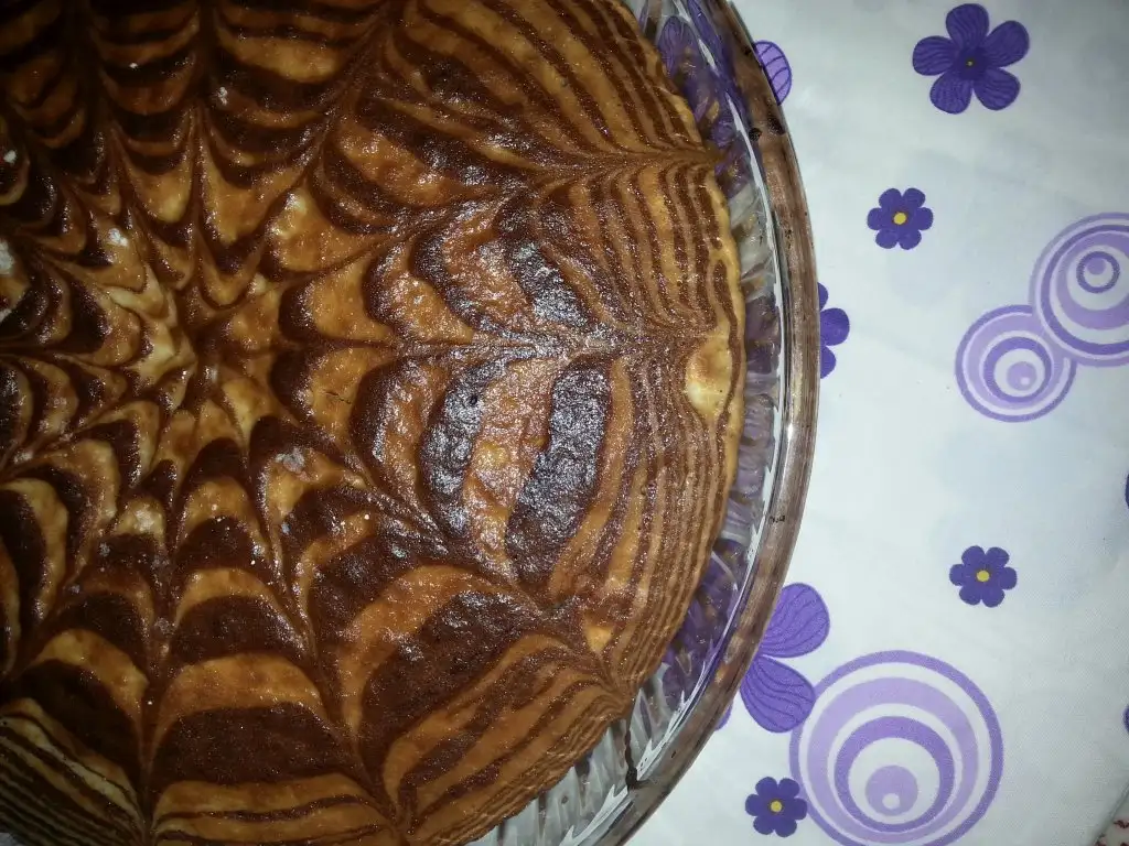 Şeker ve yumurtayı köpük olana kadar mikser ile çırpın. Kakao hariç diğer malzemeleri sırayla ekleyin ve karıştırmaya devam edin. Hamuru ikiye bölün, birine kakaoyu ilave edin. (Ben yuvarlak borcam kullandım) Fırın tepsisini yağlayın ve tam ortasına bir kepçe sade hamurdan sonra bir kepçe kakaolu hamurdan ekleyin. Hamur bitene kadar devam edin. Siz ilave ettikçe hamur yayılacaktır. Sonra ince bir bıçak ucu ile dıştan içe doğru çizin (Fotoğrafta olduğu gibi, oldukça zevkli şekil verin. 180 derece ısınmış fırında 40-45 dakika kadar pişirin. Sonra kürdan yardımı ile kontrol edin hala hamur ise 10 dakika daha pişirebilirsiniz. Afiyet olsun :)