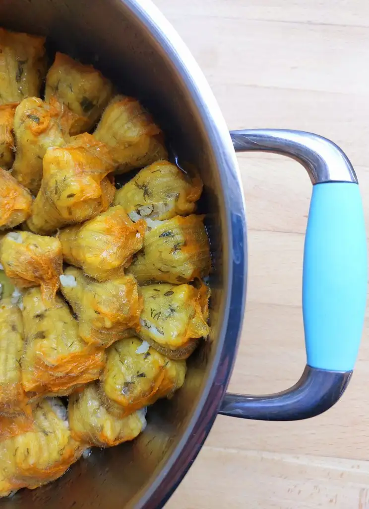 - Suyunu çeken pirinçlere ince doğranmış, maydanoz ,dereotu ve naneyi ilave edip karıştırıyoruz ve tencerenin altını kapatıyoruz. Kabak çiçeklerinin alt taç yapraklarını ve ortasını ayıklıyoruz .Ortasına iç harçtan dolduruyoruz ve uç kısımlarını büküp altlarını kıvırarak tencereye diziyoruz..
