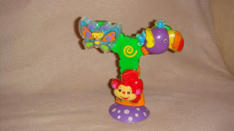 Çıngıraklı yel değirmeni; mama sandalyesinin üzerine vantuzlanarak çocuk değirmeni döndürdükçe sesler çıkarıyor.