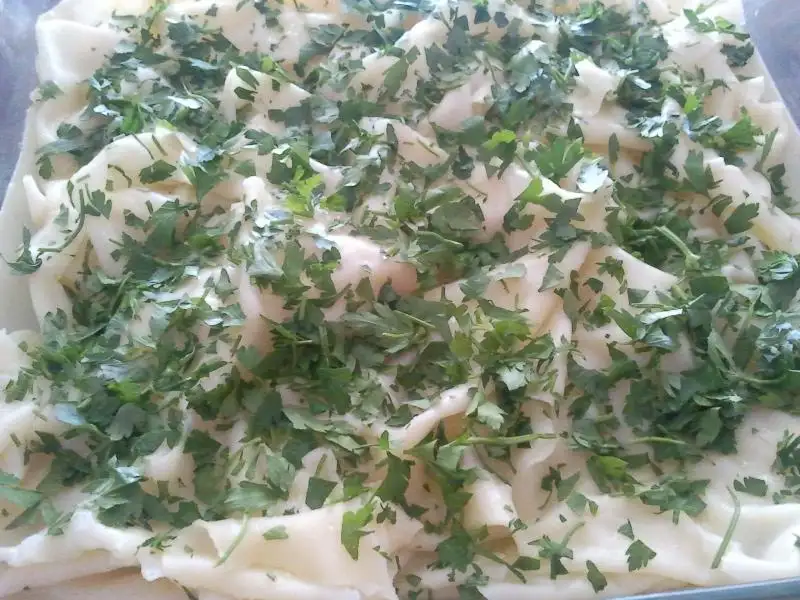 *Tepsiye serilir ilk 5 yufka bitince araya önce ince kıyılmış maydanoz sonra beyaz peynir serpilir