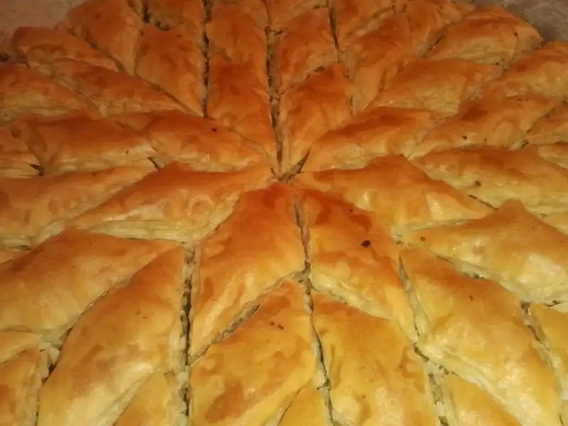 *Açılan yufka tepsiye serilir bir yemek kaşığı yağ ve bir avuç ceviz serpilir