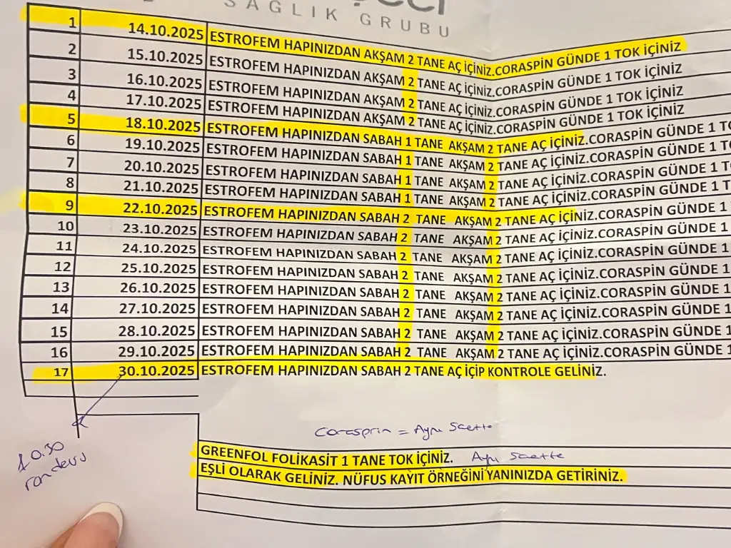 Estrofemin adedinin farklılaştığı günler vardı ama benim böyleydi. Son kontrol sonrası (sizin 30 ekimdeki) progesteranlar (iğne + fitil), oksapar vb. eklendiKızlar doktor bana bu programı verdi 30 Ekimde gideceğim kontrole muhtemelen 3 Kasım gibi transfer olacak sizinde ilaçlar böyle miydi