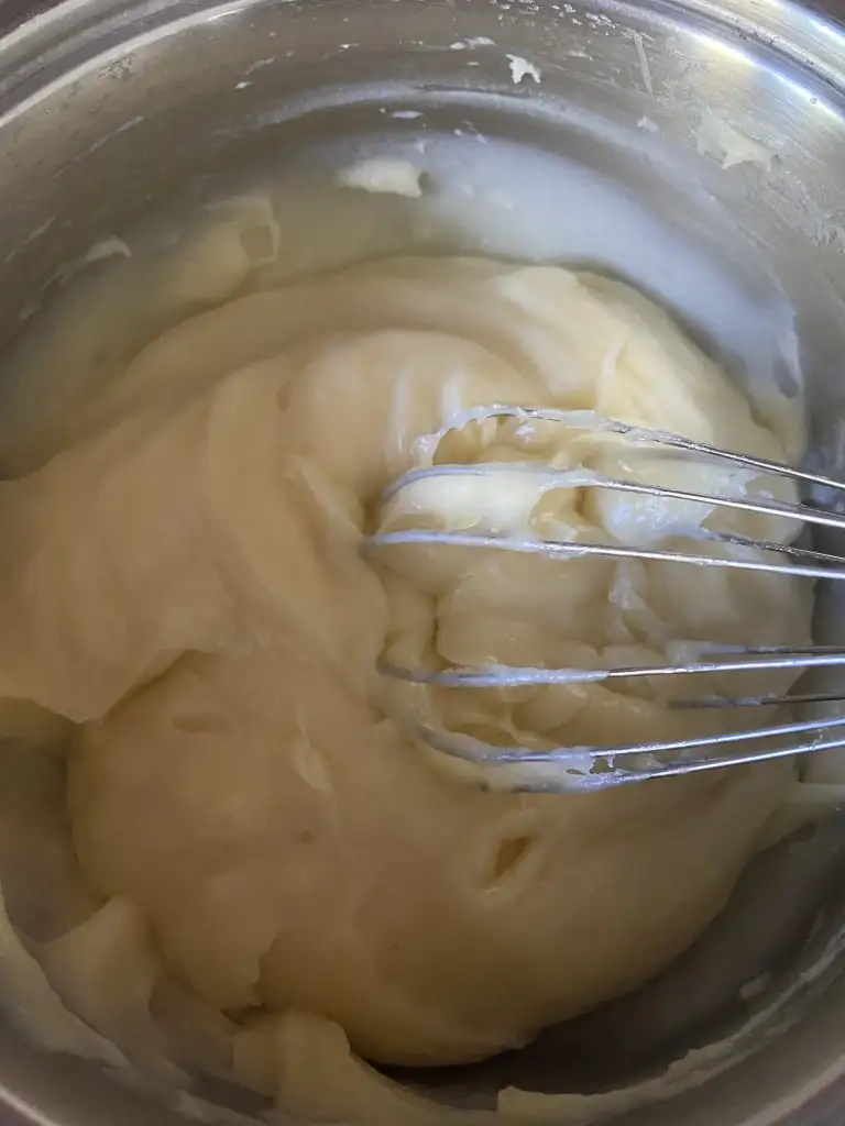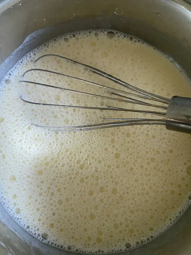 Tüm krema malzemelerini bir tencereye alıp, iyice çırpıyoruz ve ocağa alıp muhallebimizi pişiriyoruz.