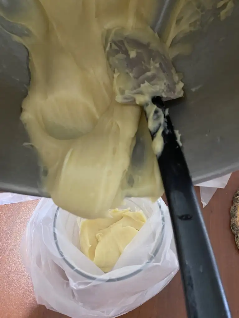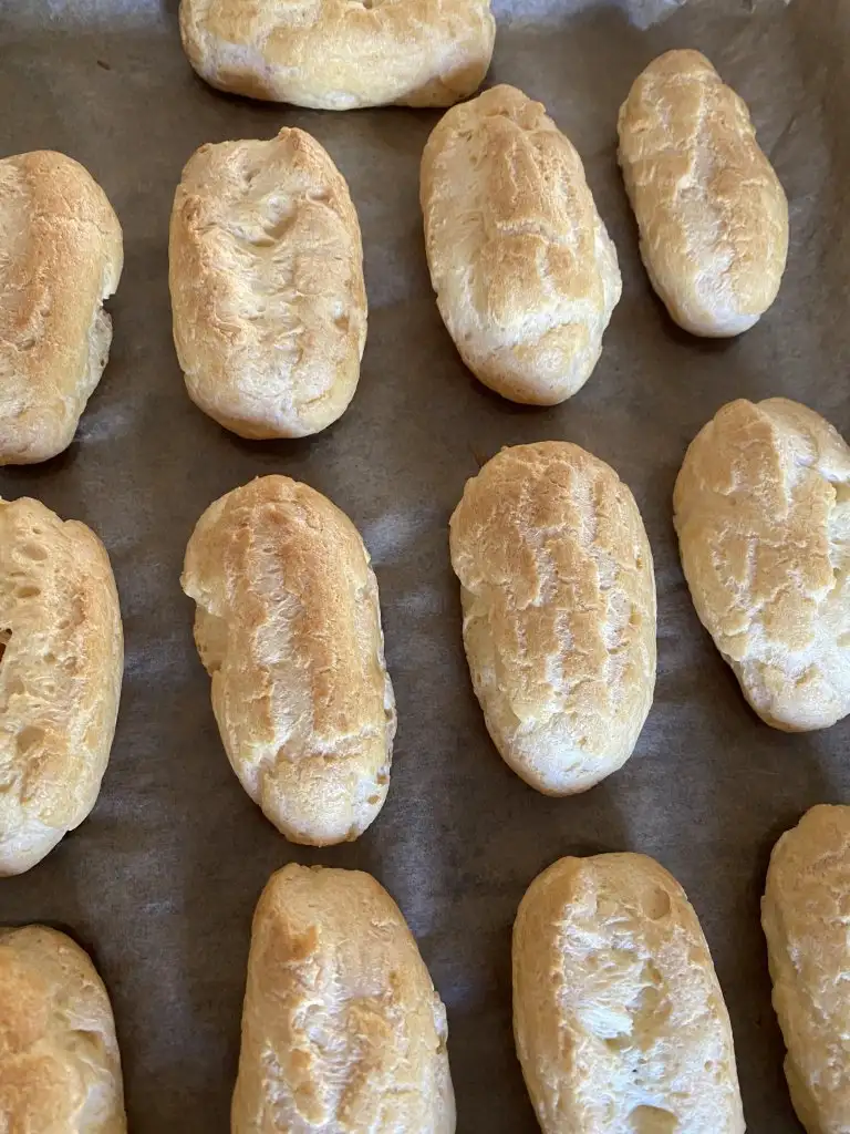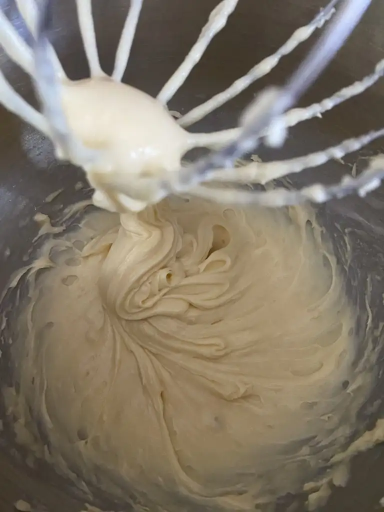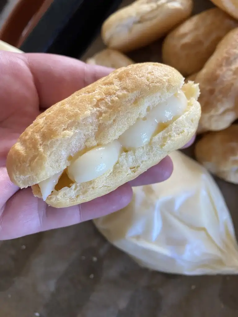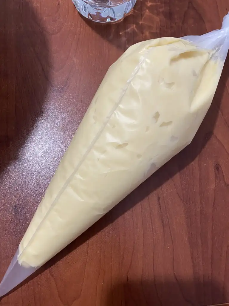 Soğuyan hamuru bir çırpma kabına alıp, ilk yumurtayı ekliyoruz ve çırpmaya başlıyoruz. Yumurta iyice hamurla özleşince 2. yumurtayı ekleyip, aynı işlemi yapıyoruz. 3. yumurtaya da aynı işlemi yapıp, hamur özleşince sıkma torbasına alıyoruz.