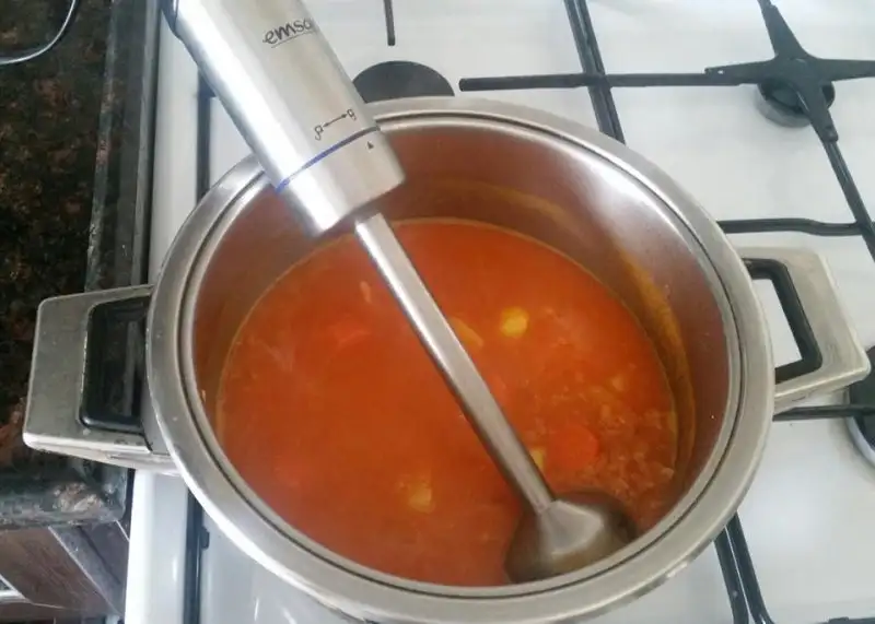 Çorbamız pişip içindeki malzemeler yumuşadıktan sonra el blenderimizle tüm malzemeleri eziyoruz.Verdiğim ölçü tamdır ama mercimeğimizin markadan markaya değişiklik göstereceği riskini hesaplarsak tüm bunların sonucunda eğer çorbamız koyu olursa azıcık kaynamış su ilave ederek çorbanın kıvamını inceltebilirsiniz.
