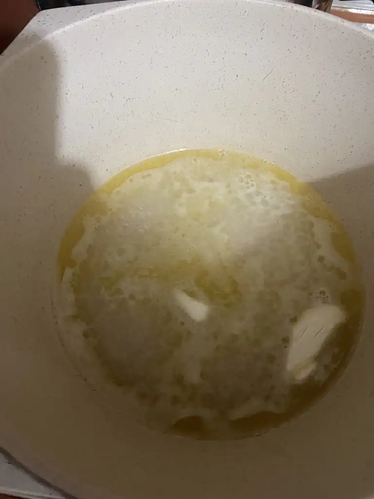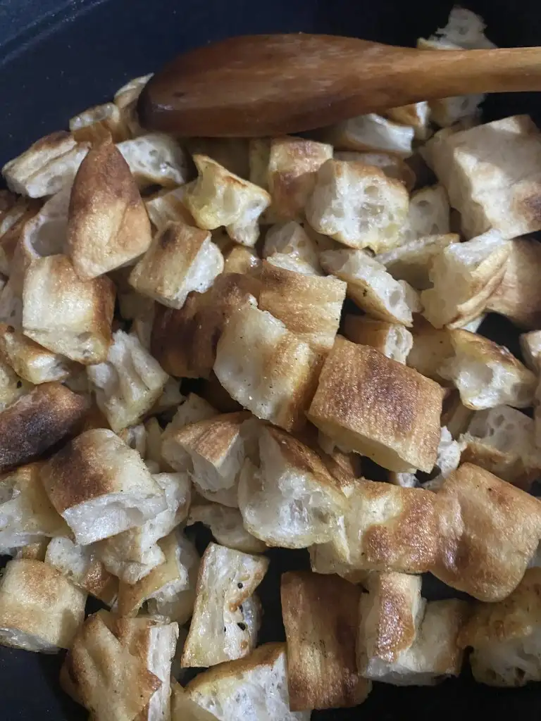 Tencereye tereyağı koyup eritiyoruz, ekmekleri içine atıp biraz kavuruyoruz.
