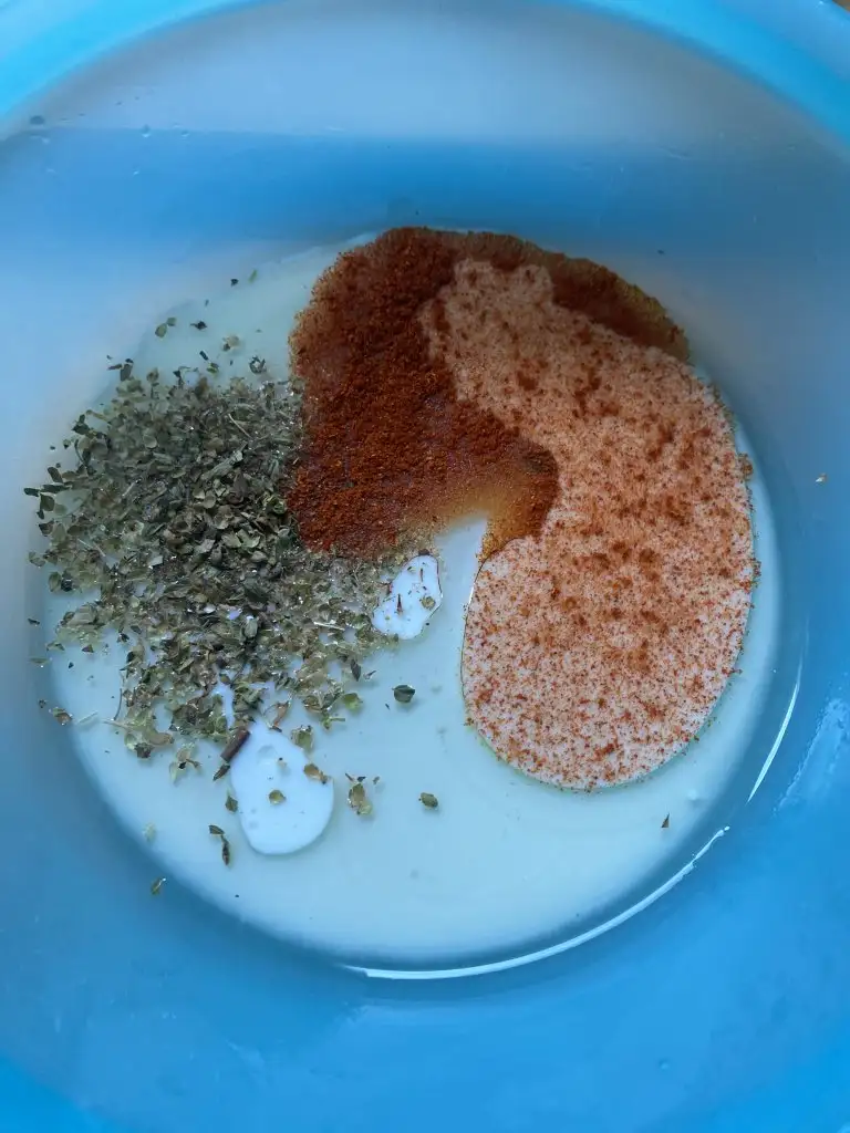Süt, zeytinyağı, biraz kekik ve toz biberi karıştırıyoruz.