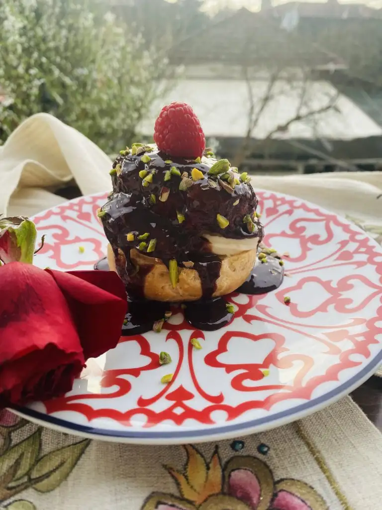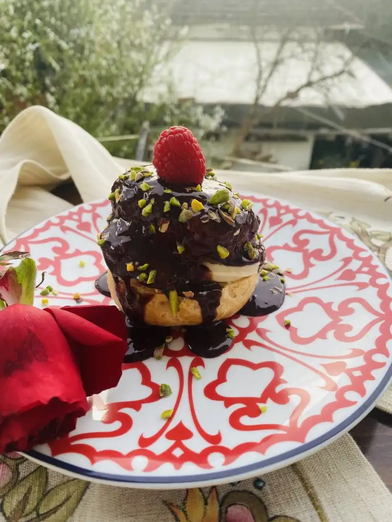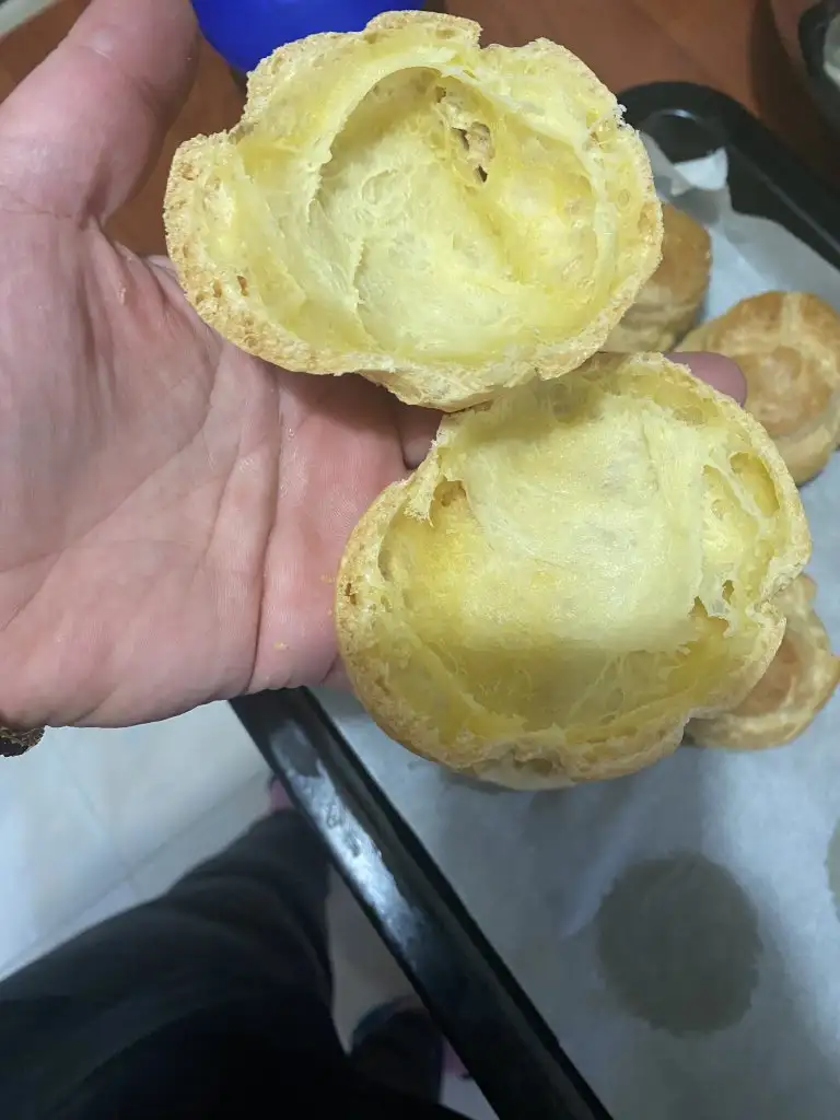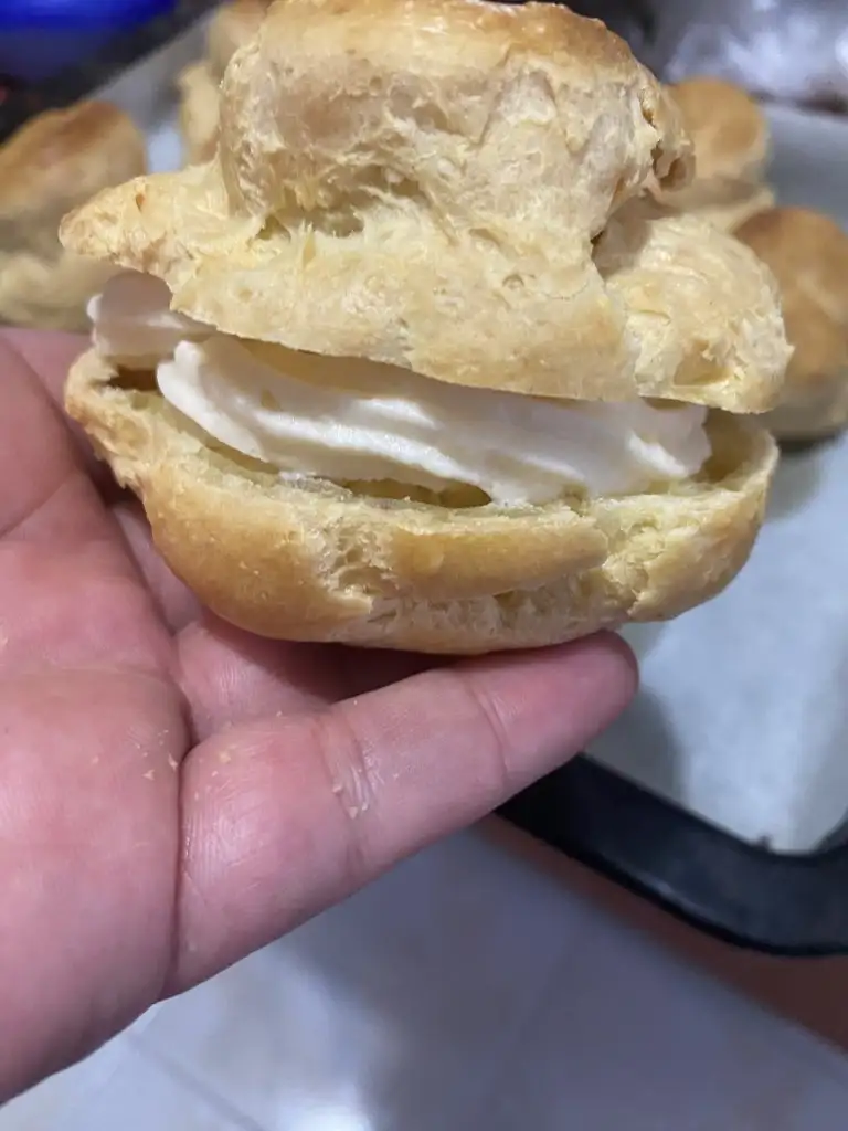Profiterol hamurumuzu ortadan kesip, arasına pastacı kremamızı koyup, kapağı tekrar üstüne koyuyoruz.