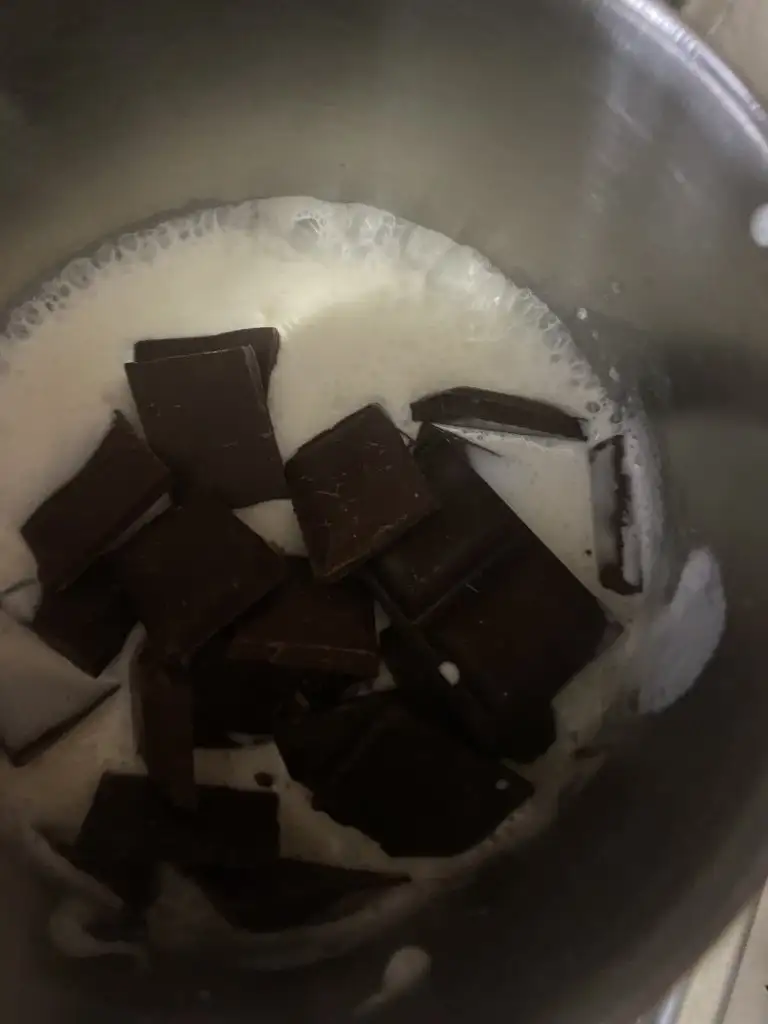Sos tenceresine yarım paket kremayı koyup kaynatıyoruz. Ardından çikolataları ekleyip, ocaktan alıp, çırpıyoruz.