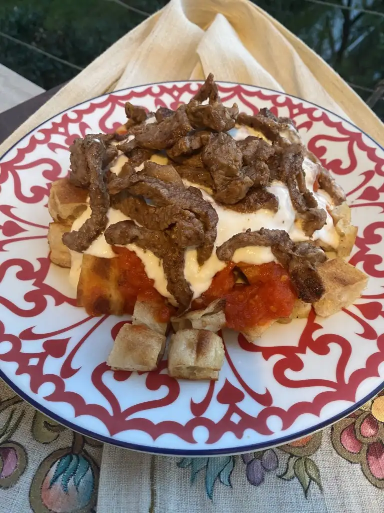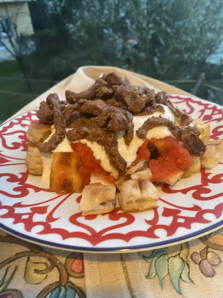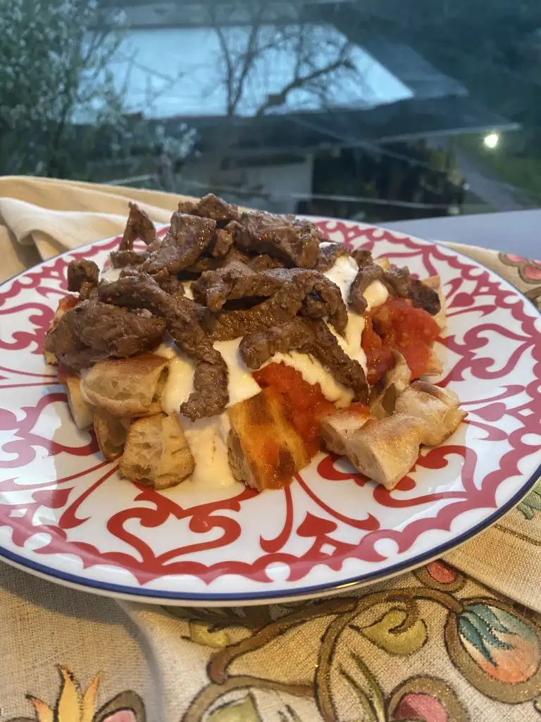 Servis tabağının en altına ekmeğimizi, üzerine domates sosumuzu, üzerine yoğurdumuzu, en üste de etimizi diziyoruz.