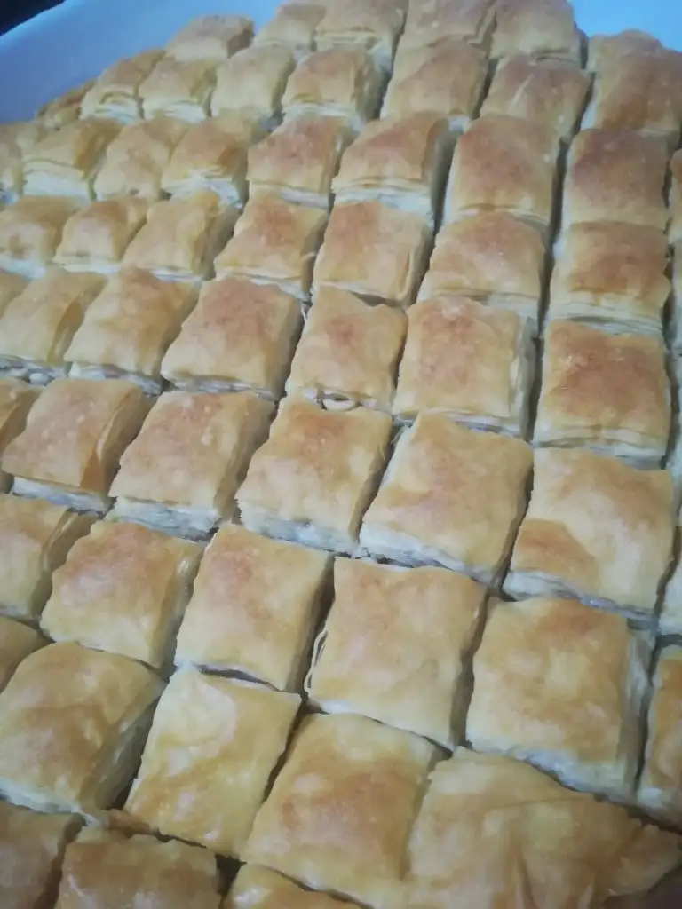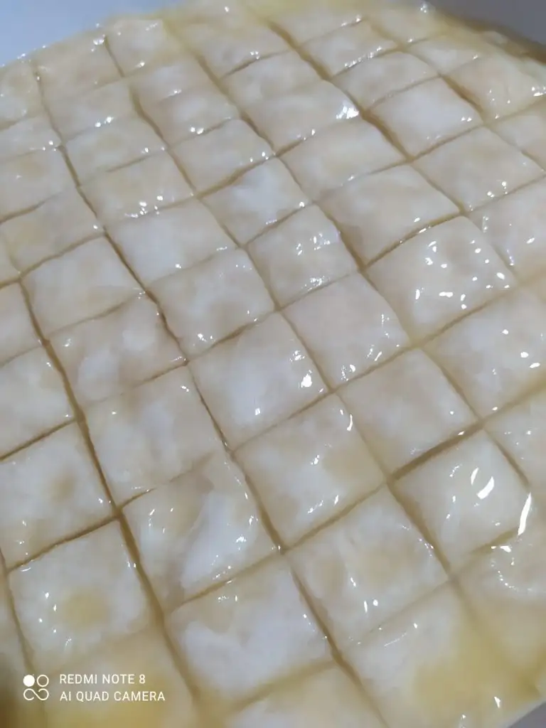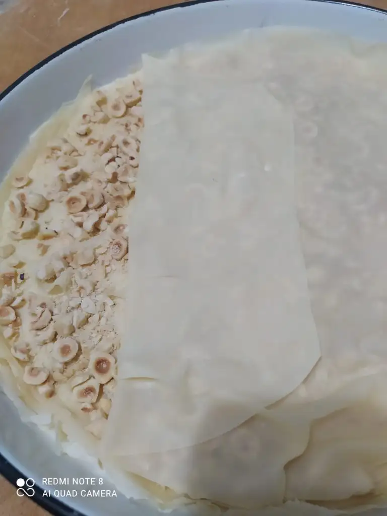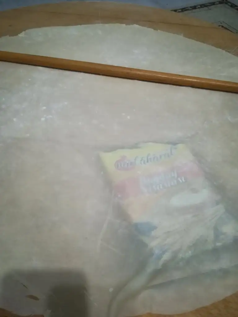 Bir beze tepsiden daha büyük açılıyor tepsiye göre kesip geri kalan kısımları da içine kat olarak aralara koyuyoruz....