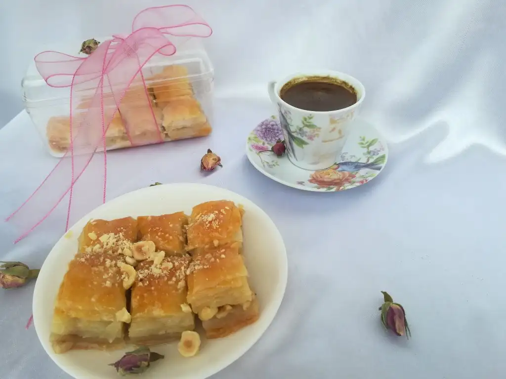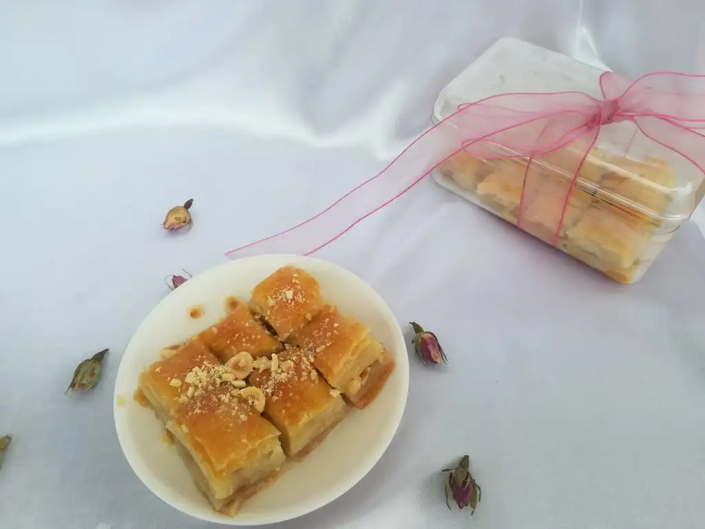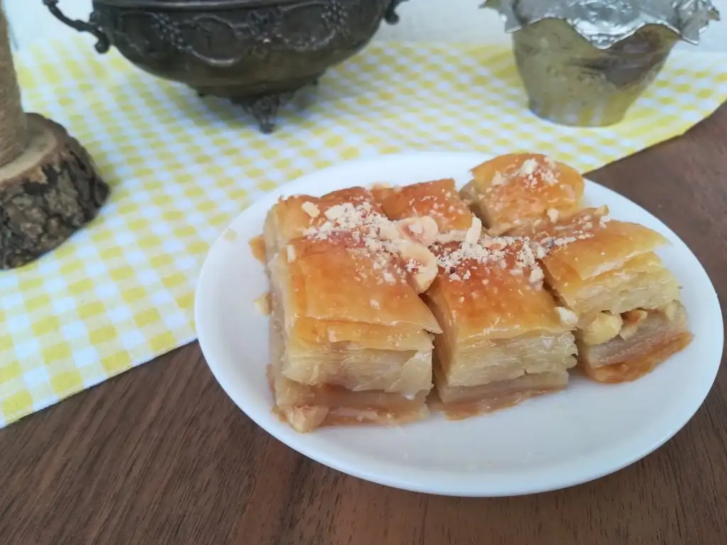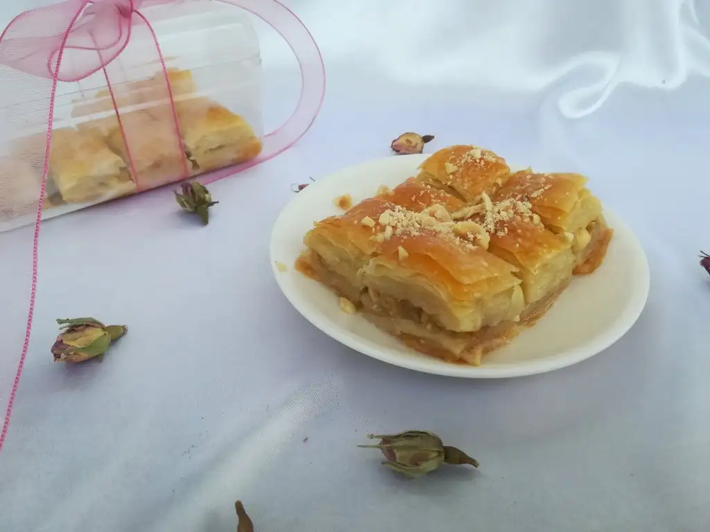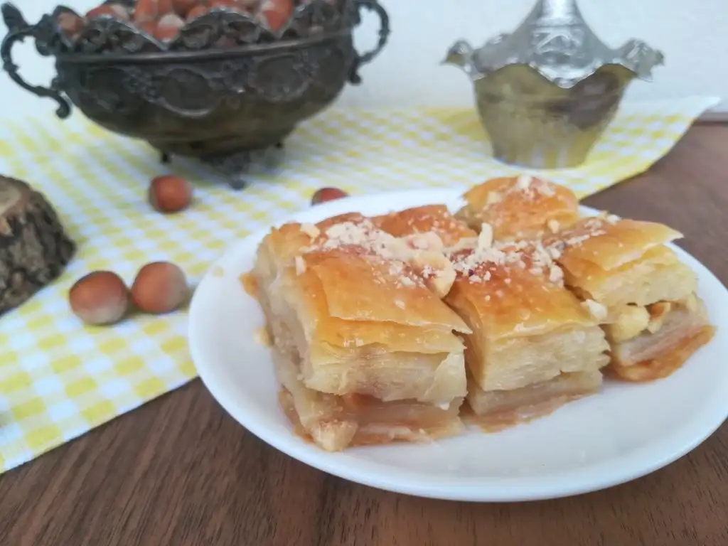 Bir beze tepsiden daha büyük açılıyor tepsiye göre kesip geri kalan kısımları da içine kat olarak aralara koyuyoruz....
