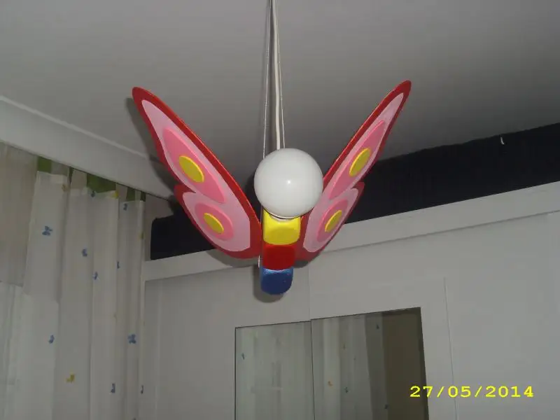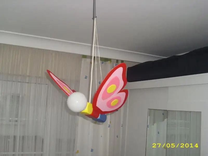 İstediginiz renklerin nasil gorunecegini bilgisayarda cizip onayinizi aliriz, tamam derseniz calismaya baslarim. Aşağıya bir resim ekledim, bunun gibi. Boylece begenmeme durumunun onune geceriz. Tamamen monte olarak gondeririz, tavana baglanma kismi vs hepsi hazir. Kutudan cikartip, herhangi basit bir avize gibi hemen asabilirsiniz. Hangi parcalari hangi renk istediginizi daha acik yazarsaniz biran once cizim yapip buraya koyarim. Mesela govde pembe, kanat turuncu vs..