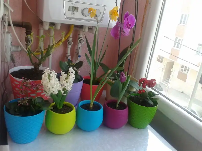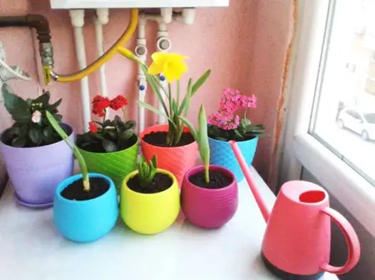 Öndeki küçük yeşil ve mor saksılara dikkatli bakın