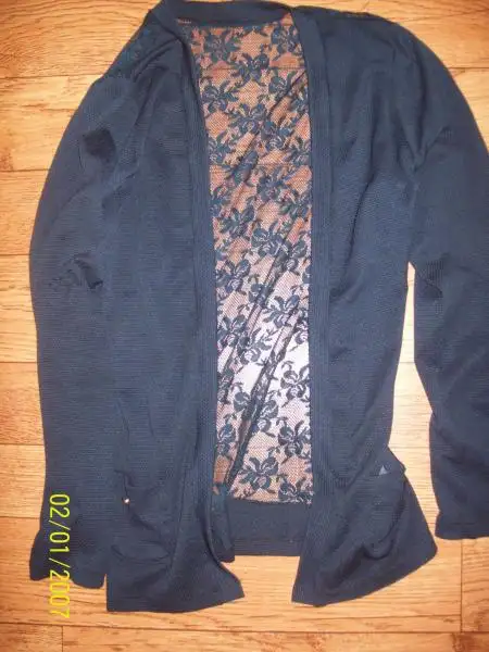 lacivert ince ceket. arkası tüllü transparan. hiç giyilmedi. yüksek bedenlere de olur. 7 lira[/