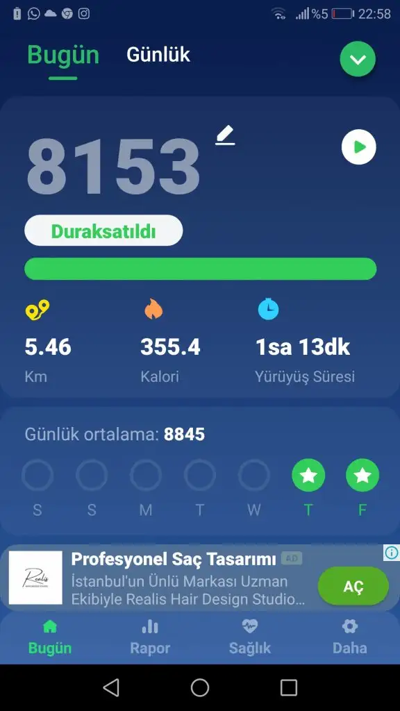 Spor 7 dk bölgesel , 38 dk fitness , 10.000 adım