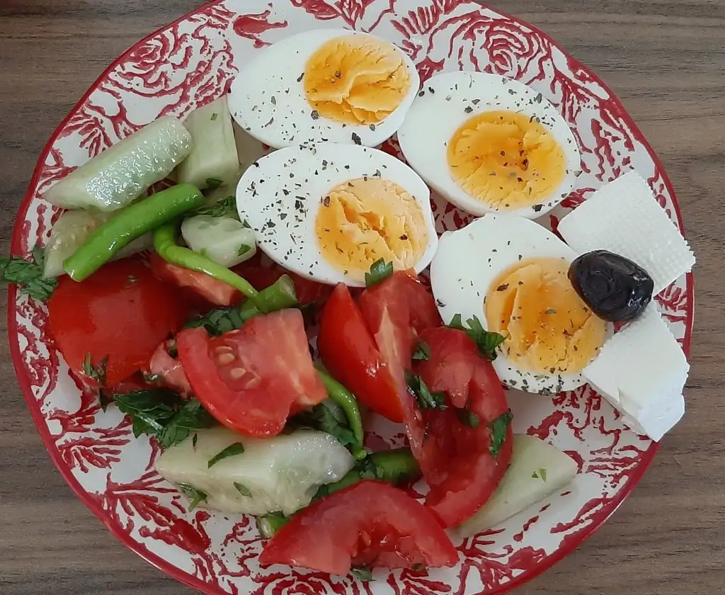 10.30 4 yk lorlu maydonozlu yumurta,domats,salatalik,1 dilim cavdar,2 tane siyah zeytin