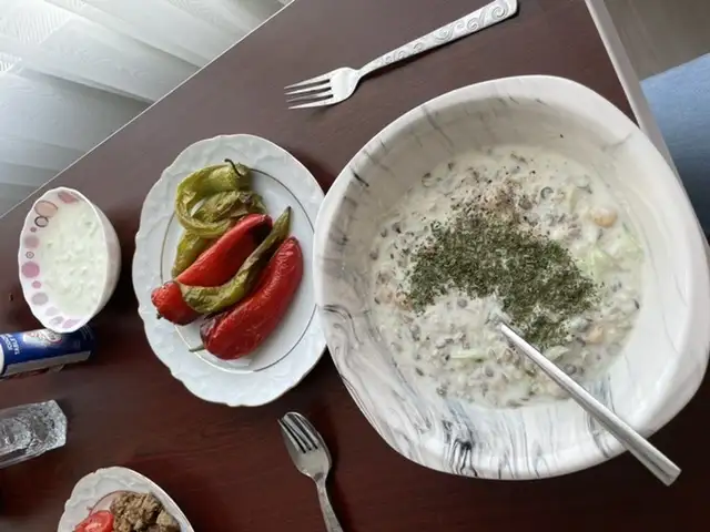 Akşam: 3 yk ev yoğurdu, 3 yk haşlanmış nohut, 3 yk haşlanmış bulgur, 3 yk haşlanmış yeşil mercimek, nane, köz biber.