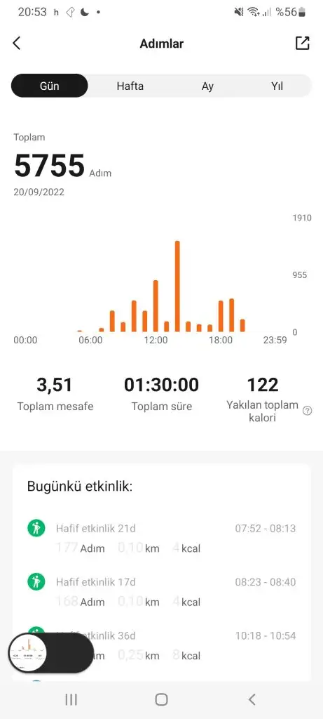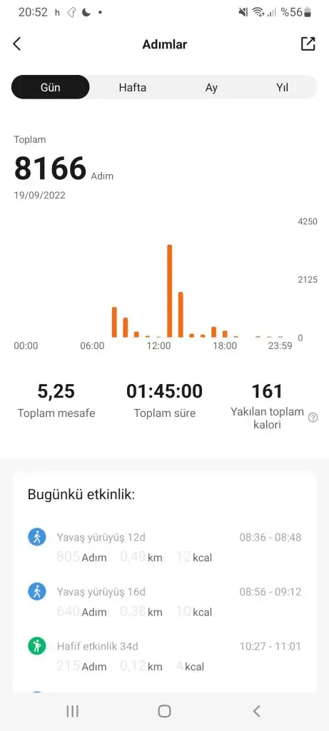 19 Eylül pazartesi de 9651 adım gösteriyor. gece yatana kadar 10.000-10.500 oldu ama kayıtlı değil.
