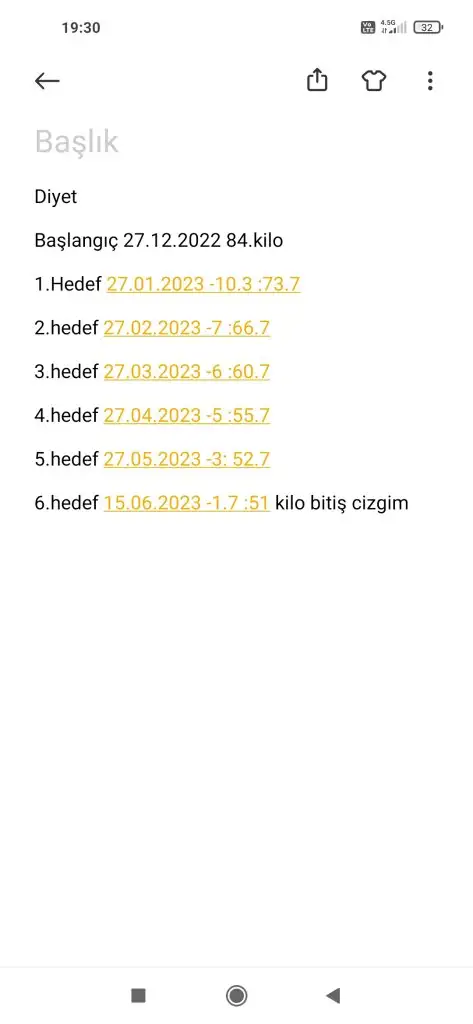 Verirsiniz kaptanım çok uçuk bir hedef değil benim diyete başlarken kendime cizdigim hedef listesini görseniz atayım durun hedeflere bakın 🥶 4 günüm var ilk hedef için 1.6 vermem lazım😭