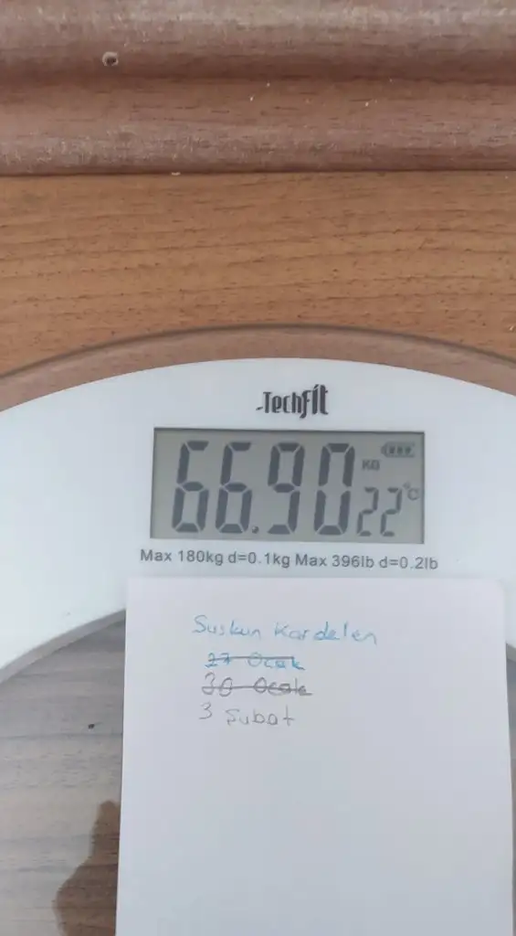 Simdi tartildim saat gece 2 şu an tsbi cay su kahve icmistim birde òdem var sabah 11 de de tartilacagim size birde onu göndereceğim haftaya hesaplarken sabahin kilosundan hesaplayabiliriz 400 500 gr daha hafif olabilirim yani öyle umuyorum