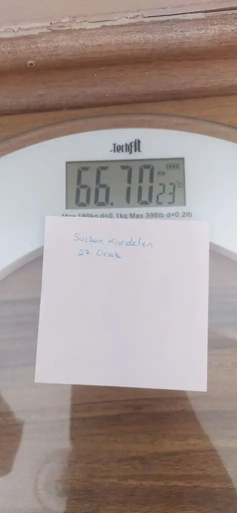 Simdi tartildim saat gece 2 şu an tsbi cay su kahve icmistim birde òdem var sabah 11 de de tartilacagim size birde onu göndereceğim haftaya hesaplarken sabahin kilosundan hesaplayabiliriz 400 500 gr daha hafif olabilirim yani öyle umuyorum(birde fazla çikiyormusum )
