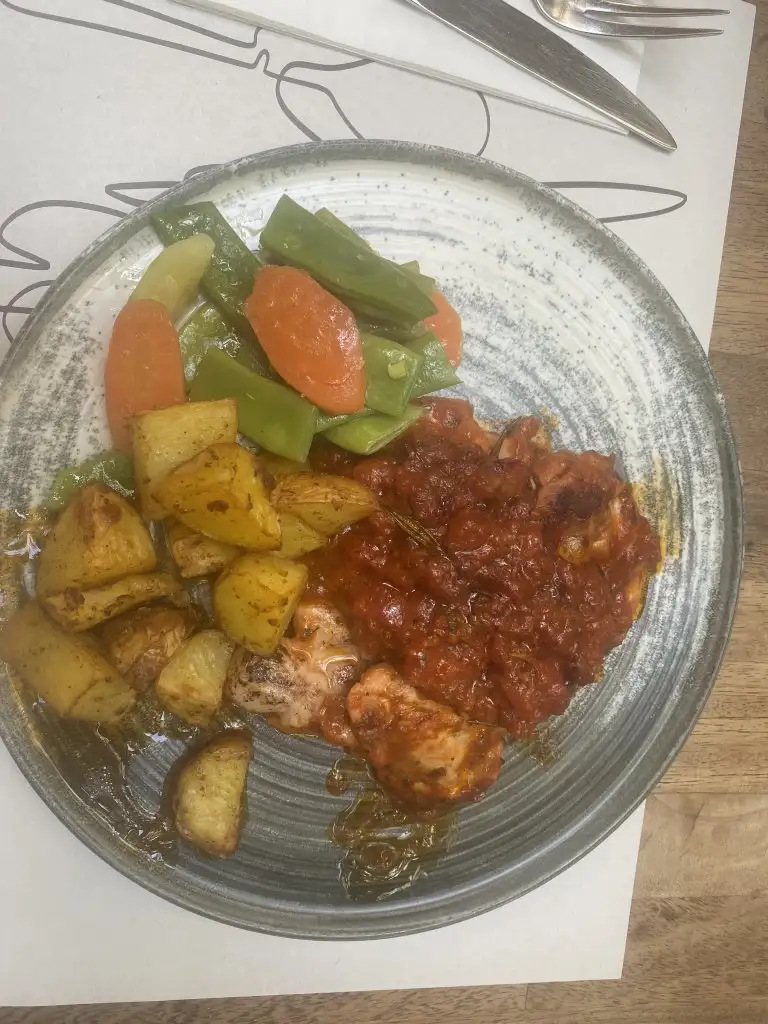 Akşam 16.30 dışarıdaydım domates soslu tavuk fotonda patates ve buharda sebzeler