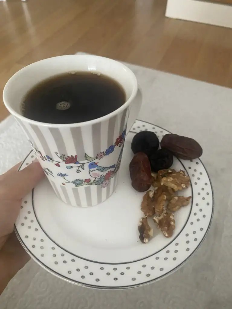 Sade nescafe, iki tane ceviz, iki hurma, iki erik kurusu