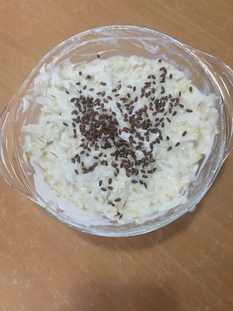 Yoğurt, bir armut 2 kaşık yulaf ve 1 çay kaşığı keten tohumu