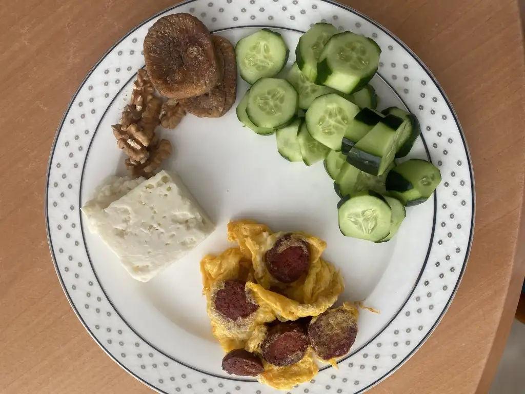 Sucuklu yumurta, salatalık, peynir, iki kuru incir, iki tane ceviz