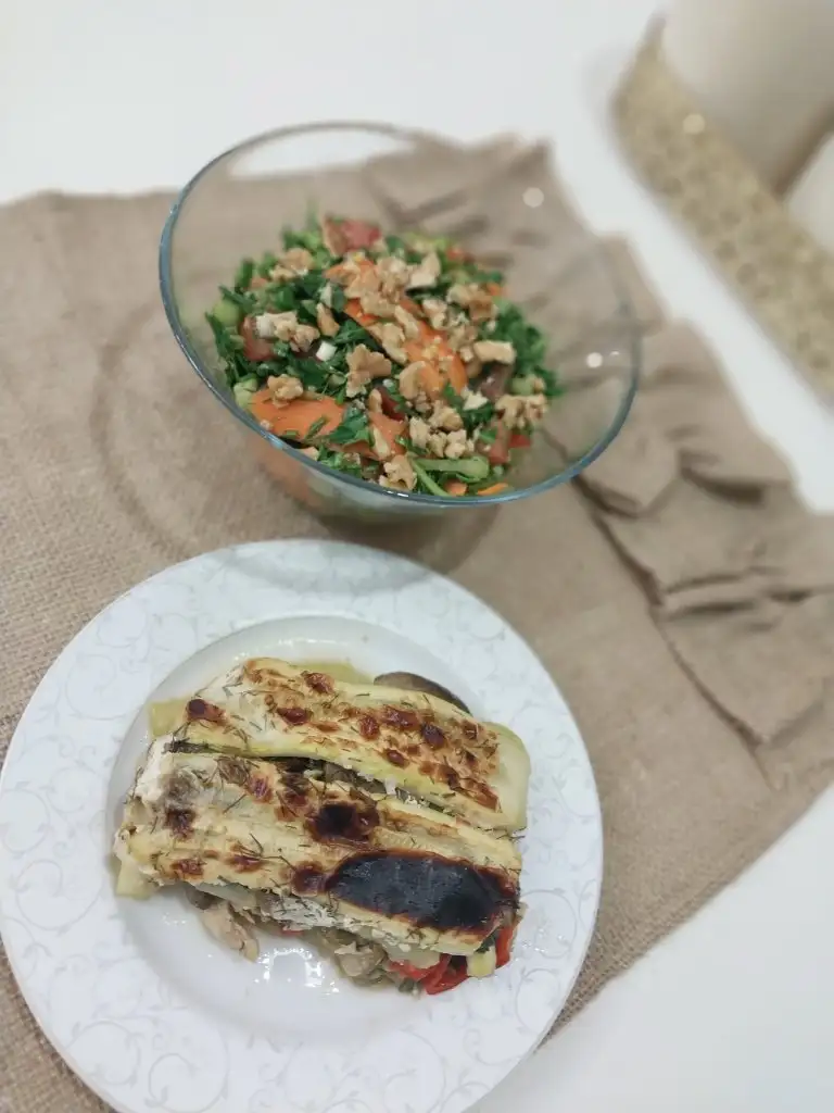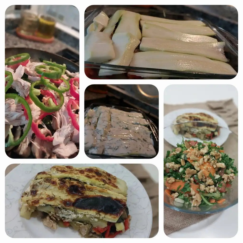 Ispanak kırmızı kapya biber yeşil biber mantar Haşlanmış tavuk göğsü tuz Karabiber pul biber 1 yemek kaşığı zeytinyağı da kavruldu 3 kabak kabukları soyulduktan sonra ince ince resimde gördüğünüz gibi uzunlamasına doğrandı 2 kat olmak üzere iç harcı koyup üzerine kabak yerleştirdim beşamel sos yerine sadece 4 kaşık yoğurt ve biraz dereotu tuz ekleyip çırpıp döktüm sağlıklı kabak lazanya tarifi geçenkinde beşamel sos yapmıştım Hindistan cevizi unuyla şu an un yok tam tamına sağlık bombası denenebilir lezzeti harika Ben bayıldım![]()