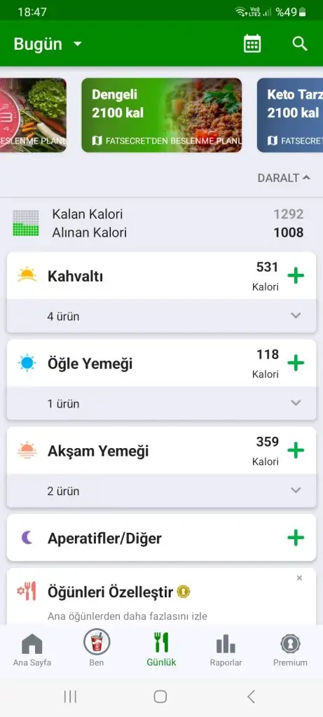 Böyle bir günlük tutuyorum kalori hesabı yapabilmek adına indirmek isteyenler için adı fatsecret