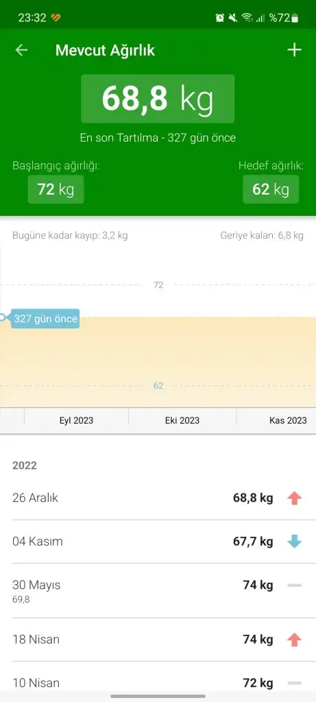 Eski kalori uygulamasını tekrar indirdim ve bi baktım 72 ile başlamışım 68 ken bırakmışım uygulamayısağol canım benim teşekkürler