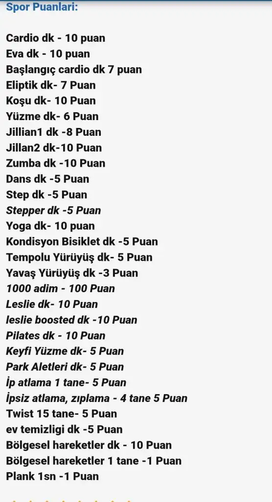 Canım gün içinde yapmış olduğun spora karşılık olan değerleri sıralayıp topluyorsun.Ben spor kısmını , puanlamayii anlamadım . Müsait zamanında aydınlatır mısın beni acaba canmm?