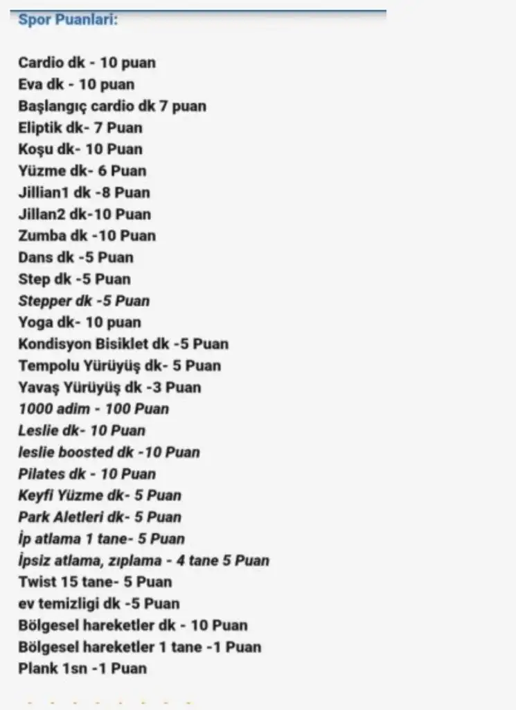 Bugünkunu de mi yaziyoruz canım? Bir de ip atlamanın puani biraz yüksek değil mi acaba ? Yarım saatlik Leslie de çok daha fazla ter atarken ip atlama o kadar da zor gelmiyor bana ne bileyim süresi fln da kısa . Ya da Leslie nin puanı mi düşük? Ben boosted olanı yapıyorum . Nefes nefese kalıyorum . Bilemedim.İnşallah canım. Bu sayfanın sporda show yapıyordu İnşallah döneceğiz o gunlere