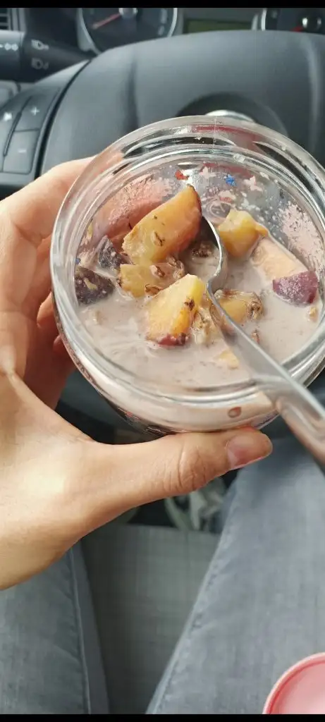 Saat 10 da ilk ogun genelde şöyle 2-3 yk granola mevsim meyvesi seklinde olmus. Yine iş,cekim vs ne olursa yanimda tasimisim bu foto arabada cekilmis cunku
