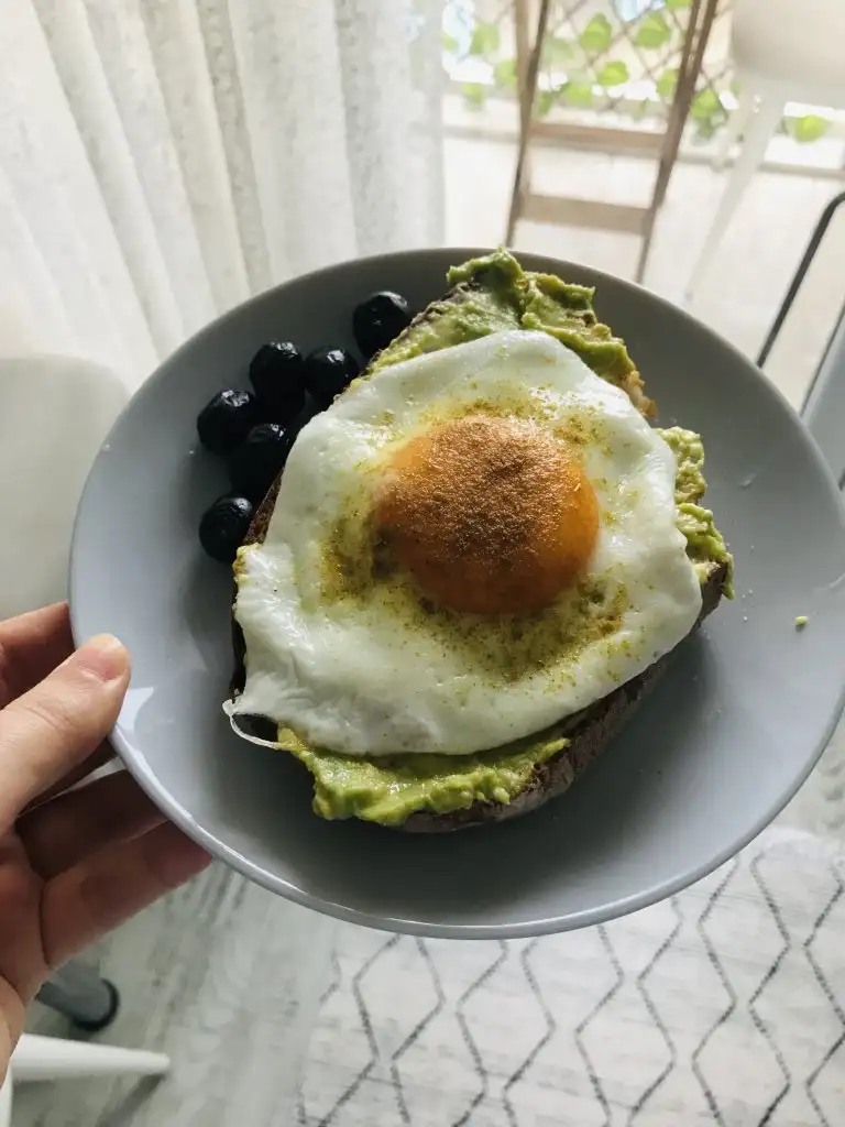 Bır dılım tam buğday kızarmış ekmek üstüne krem peynır üstüne avokado sos üstüne bir adet yumurta 3-5 zeytin