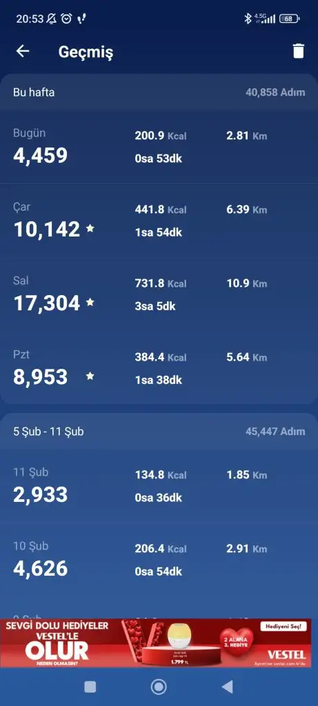 Adım sayilarim. Dün ve bugün ip atlama yoktu.