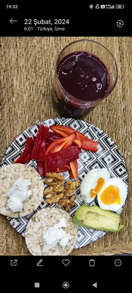 Ceyrek avokado,2 ceviz,1 kapya,1 haş yumurta,2 misir patlagi ustunde 1 yk labne,pancar suyu