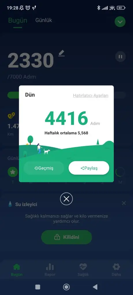 Su 3.5 litre spor 1 saat tempolu yürüyüş ve 7249 adım