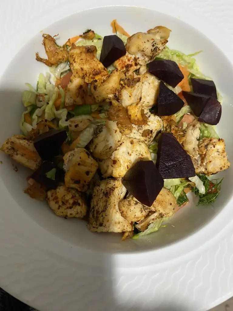 1 tabak yeşil salata üzerine tavuk göğsü yanındakiler de kırmızı pancar