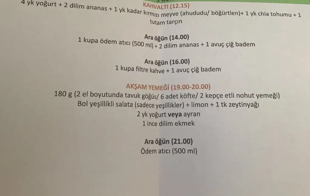 Diyetisyenden geldim 1.6 kg artı çıktı. Kas ve yağda artış yok. Ödem aşırı yükselmiş %49 a inmişti şimdi %53 olmuş. Bu hafta ödemi atmaya yönelik liste verdi.