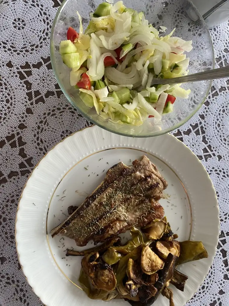 Sebzeler airfryer da pişti, yanındaki kırmızı et.