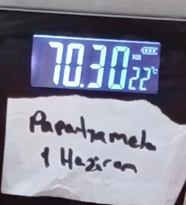 Diyet kafasından çıkmış durumdayım ne yapcm bilmiyorum bari bayrama kadar 60 ı görsem diyorum oda olmuyor yüzdüm yüzdüm sona geldim saçmaladım evde değilim farklı bir tartı ile sonuç bu