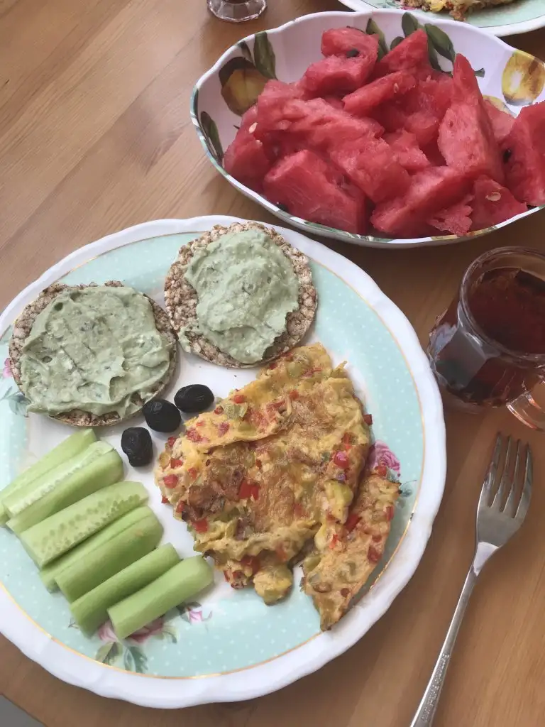 Kahvaltı: zeytin, salatalık, 2 karabuğday ptlağı üzerine avokado sos, sebzeli omlet, karpuz