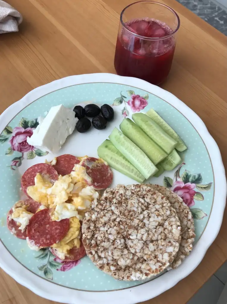 Kahvaltı: zeytin, peynir, salatalık, 2 kb patlağı, sucuklu yumurta (40g sucuk 1 yumurta), ev yapımı meyve suyu 1 bardak
