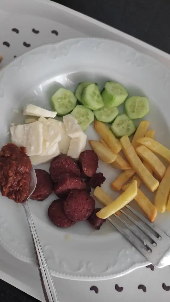 Öğlen 12// az sucuk az patates kızartması airfrier da yağ sıfır az salatalık az ezme 1yaprak sarma birazda peynir ve iki dilim kepek ekmeği şekersiz çay