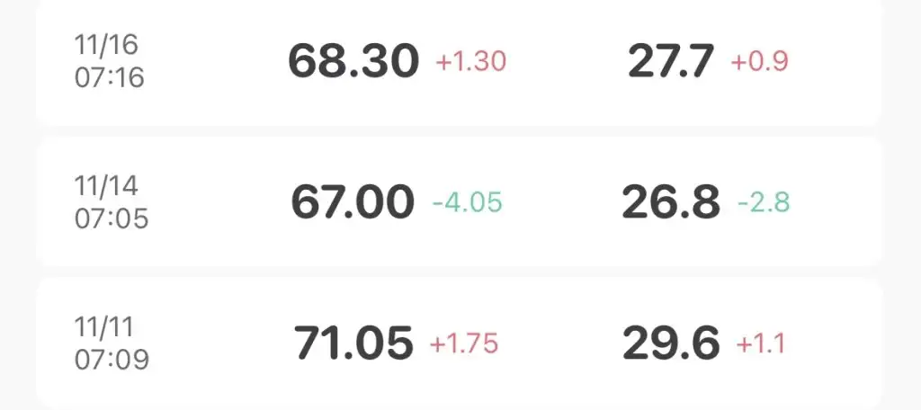 pazartesi-perşembe ve cumartesi sabah tartı sonuçlarımı ekliyorum, diyetime sporuma döndüğüm gün başlangıç tartısı 71.0, 3 gün ağır detox sonrası ödem attığım gün(gruba ilk tartı fotosu attığım zaman) 67, dengeli beslenme ve sporla devam ettiğim halimle 68.3 bu sabah.